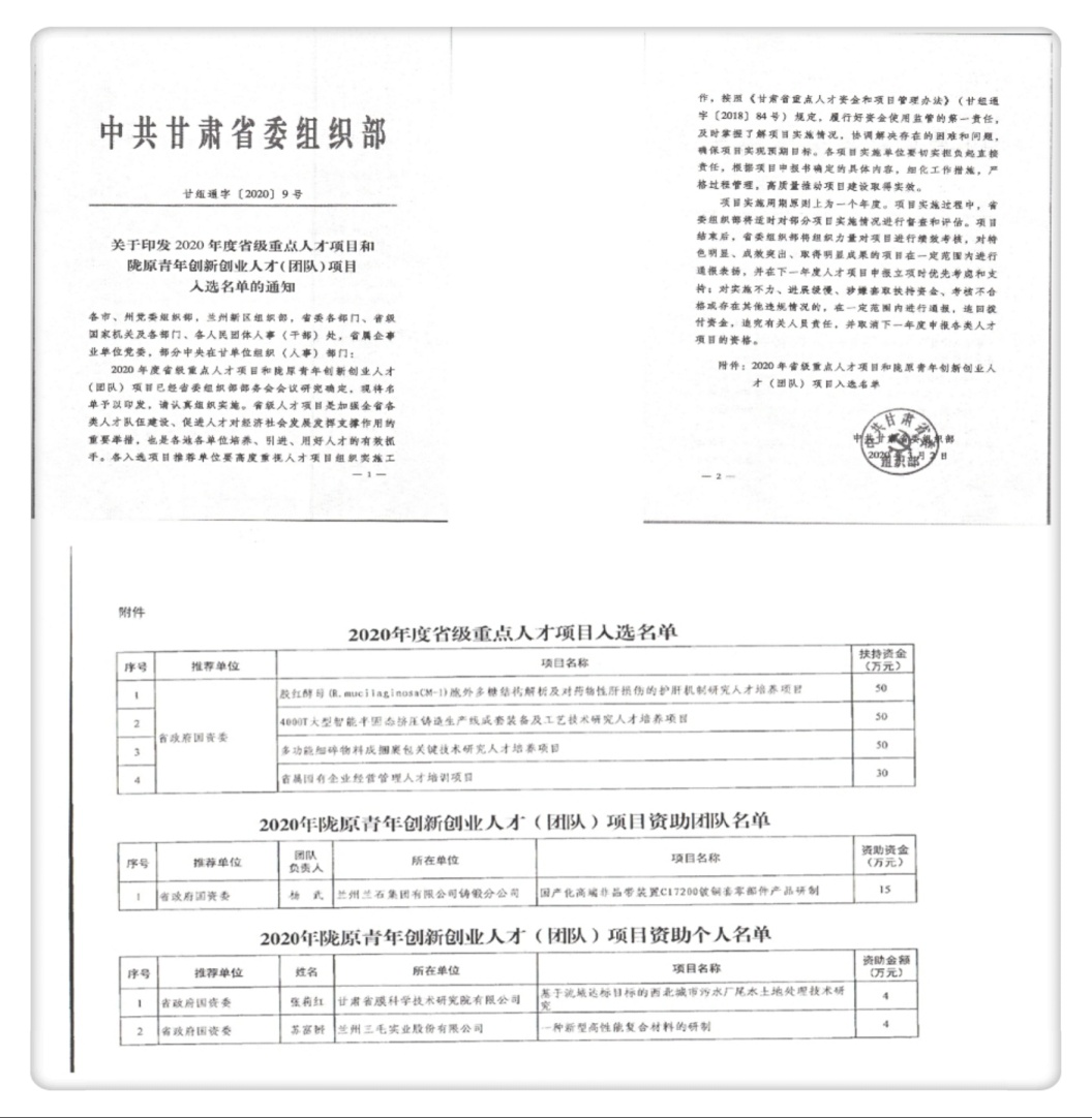 近日,中共甘肅省委組織部印發(fā)通知,公布了2020年度省級重點人才項目和隴原青年創(chuàng)新創(chuàng)業(yè)人才(團隊)項目入選名單。我公司蘇富赟同志申報的“一種新型高性能復合材料的研制”項目成功入選甘肅隴原青年創(chuàng)新創(chuàng)業(yè)人才(團隊)項目并獲得資助。