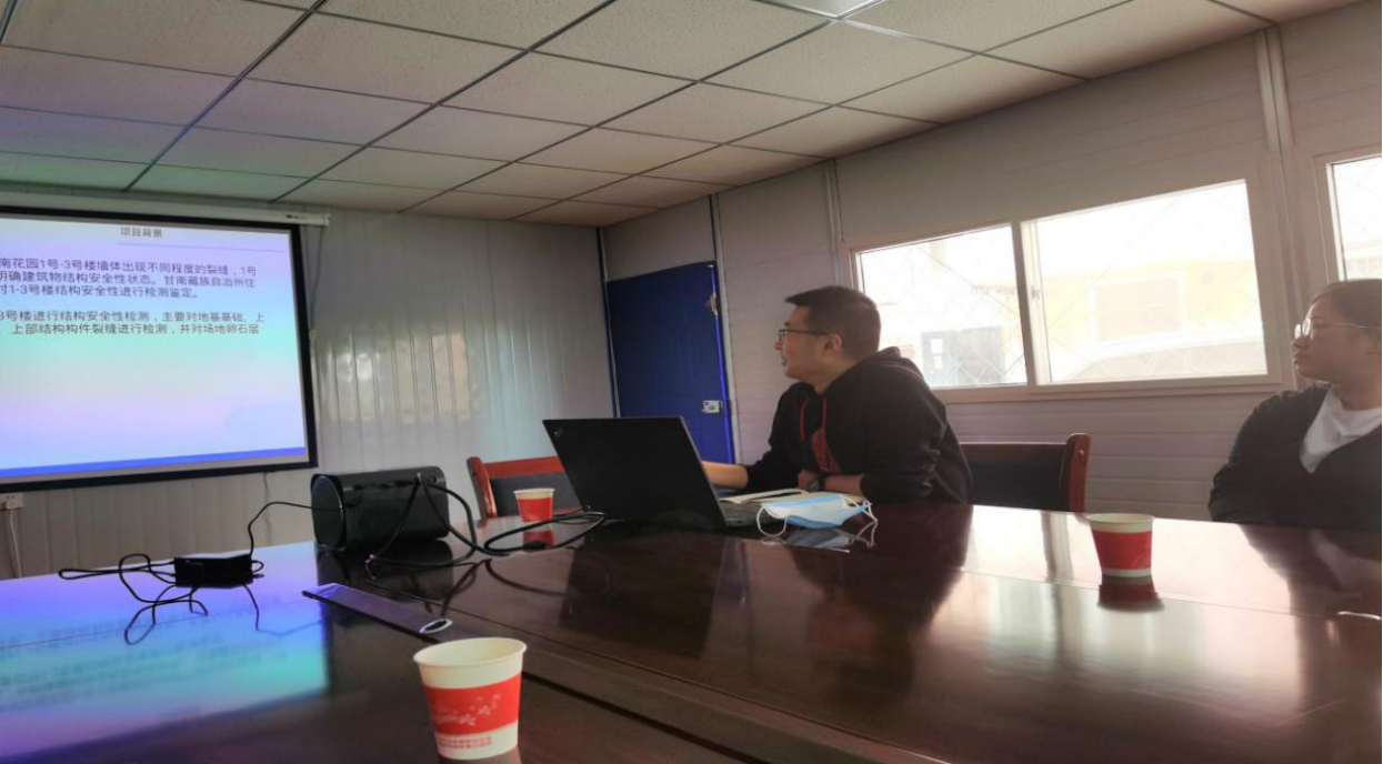 張健一行首先觀摩了結(jié)構(gòu)加固中心承接的甘南州2020年大砂坪甘南花園老舊小區(qū)改造項(xiàng)目現(xiàn)場(chǎng),聽(tīng)取了結(jié)構(gòu)加固中心何志峰有關(guān)“甘南州 2020 年大砂坪甘南花園老舊小區(qū)改造項(xiàng)目(一期)”糾偏加固方法、施工組織管理及安全措施等的講解;工程質(zhì)量檢測(cè)部年輕技術(shù)人員羅軍峰同志對(duì)“蘭州市口腔醫(yī)院異地新建項(xiàng)目基坑監(jiān)測(cè)項(xiàng)目”進(jìn)行了交流學(xué)習(xí);最后由巖土工程研究所呂永平同志對(duì)“蘭州地區(qū)大厚度濕陷性黃土場(chǎng)地地基處理工程實(shí)例”進(jìn)行了講解。