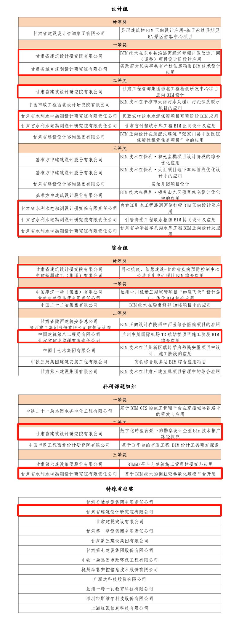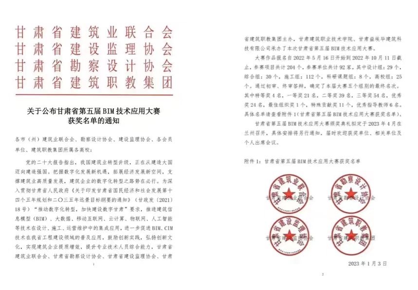 日前,甘肅省第五屆BIM技術(shù)應用大賽結(jié)果公布,甘肅工程咨詢集團共獲得14個獎項,其中,“BIM技術(shù)在東鄉(xiāng)縣沿洮河經(jīng)濟帶棚戶區(qū)改造二期(調(diào)整)項目設計階段的應用”等8個項目分別獲設計組一、二、三等獎,“同心抗疫,智慧建造—甘肅省疾病預防控制中心公共衛(wèi)生中心項目BIM綜合應用”等3個項目分別獲綜合組特等獎及一、二等獎,“數(shù)字化轉(zhuǎn)型背景下的勘察設計企業(yè)BIM技術(shù)推廣路徑探究”等2個項目分別獲科研課題組二、三等獎,建筑設計院獲特殊貢獻獎。