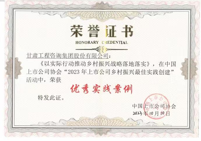 近日,在中國上市公司協(xié)會主辦的上市公司鄉(xiāng)村振興經(jīng)驗(yàn)交流會暨最佳實(shí)踐案例發(fā)布會上,由甘肅工程咨詢集團(tuán)申報(bào)的鄉(xiāng)村振興實(shí)施案例榮獲“優(yōu)秀實(shí)踐案例”。