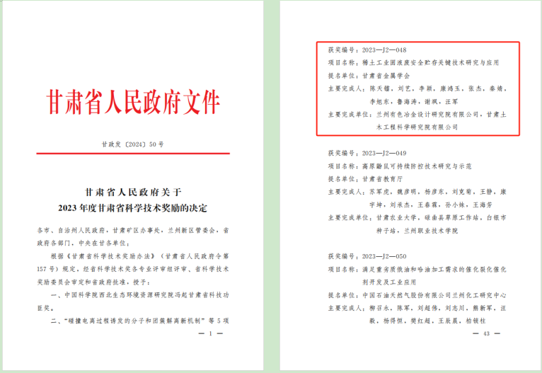 近日,2023年度甘肅省科學(xué)技術(shù)獎(jiǎng)結(jié)果揭曉,公司和蘭州有色冶金設(shè)計(jì)研究院有限公司聯(lián)合申報(bào)的科技成果項(xiàng)目《稀土工業(yè)固液廢安全貯存關(guān)鍵技術(shù)研究與應(yīng)用》榮獲2023年度甘肅省科技進(jìn)步獎(jiǎng)二等獎(jiǎng)。