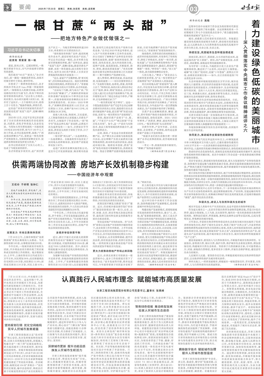7月14日至15日,中央城市工作會議在北京舉行。這是時隔十年,黨中央再次召開的城市工作會議,為新時代新征程城市工作指明方向。甘肅工程咨詢集團深入學習貫徹習近平總書記關(guān)于城市工作的重要論述,全面落實中央城市工作會議精神,認真踐行人民城市理念,立足區(qū)域發(fā)展實際,將集團公司七十余年技術(shù)積淀轉(zhuǎn)化為服務人民需求的實踐動能,在優(yōu)化城市空間格局、提升城市功能品質(zhì)、推動綠色低碳轉(zhuǎn)型、賦能智慧高效治理等領(lǐng)域精耕細作,助推全省城市建設(shè)向著高度與溫度并存、發(fā)展與惠民同步的方向邁進。