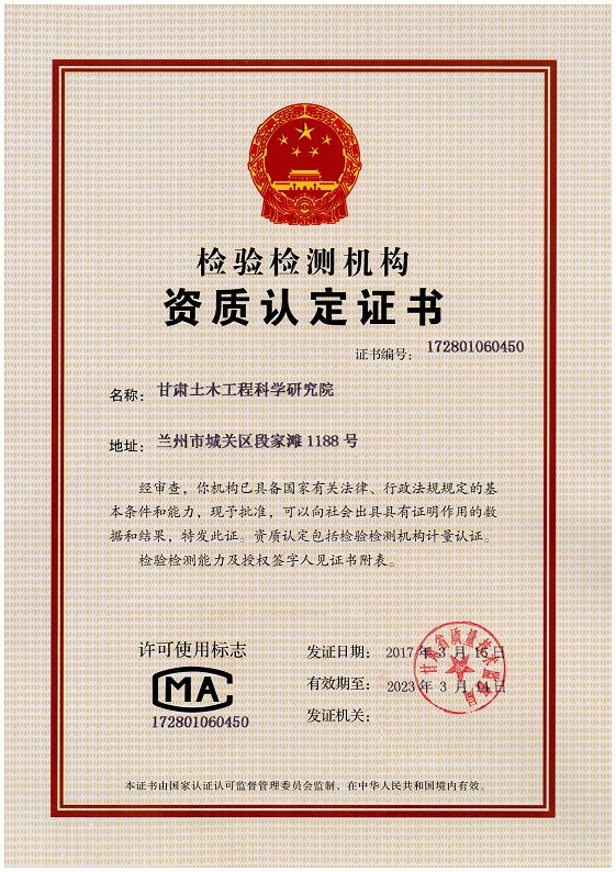 2003年初次通過甘肅省檢驗檢測機(jī)構(gòu)資質(zhì)認(rèn)定,法律地位明確,組織機(jī)構(gòu)健全,人員能力、儀器設(shè)備配置、場所環(huán)境條件等均滿足檢驗檢測工作要求。具備建筑材料、巖土工程、工程結(jié)構(gòu)、建筑節(jié)能、室內(nèi)環(huán)境、鋼結(jié)構(gòu)檢測能力,通過了39類產(chǎn)品,736個參數(shù)的檢測能力認(rèn)定。期間歷經(jīng)多次監(jiān)督評審、換證復(fù)評審,持續(xù)有效運行16年。